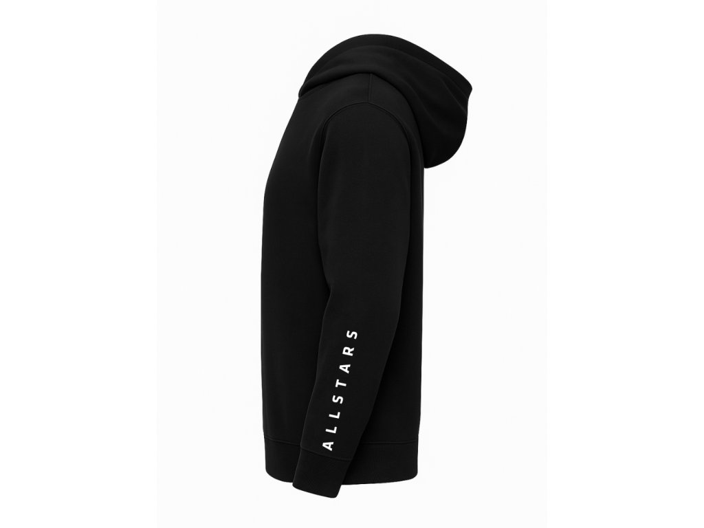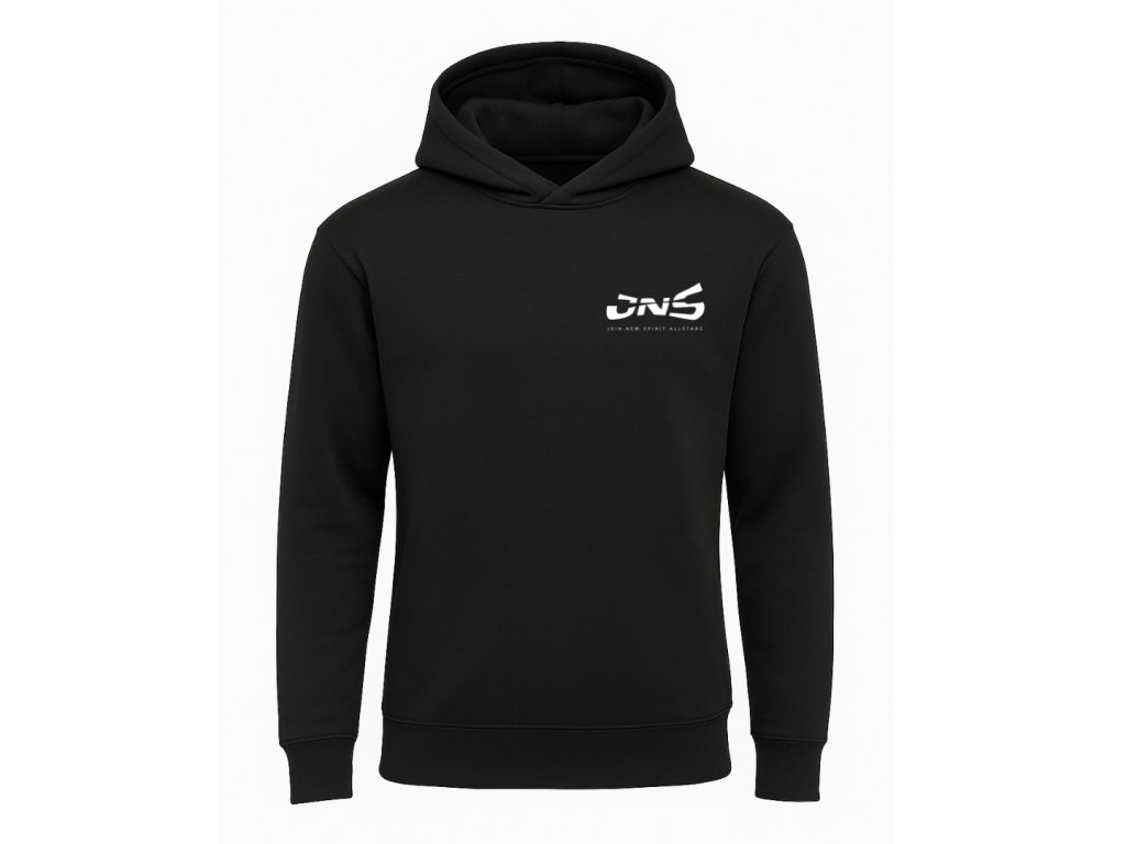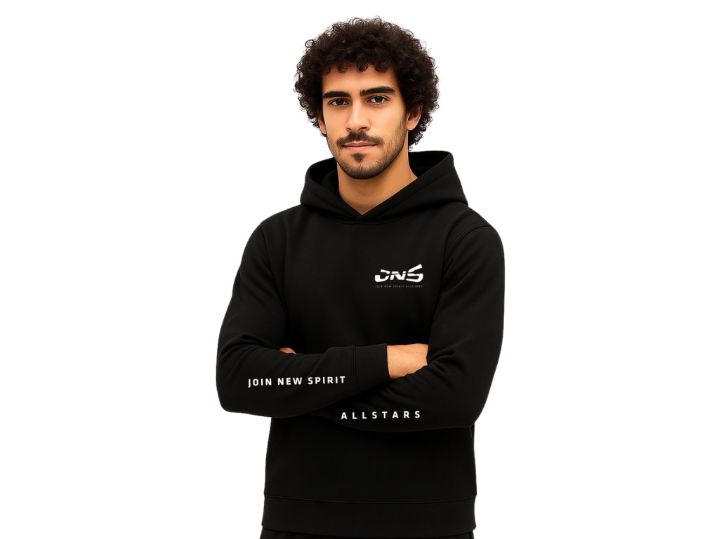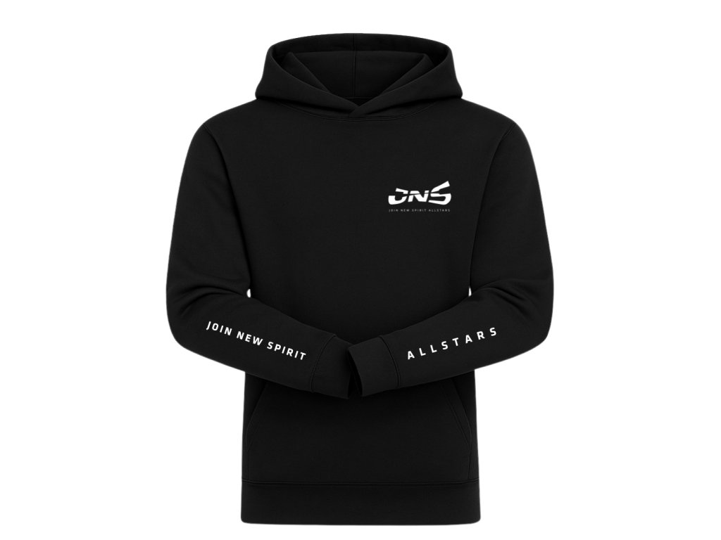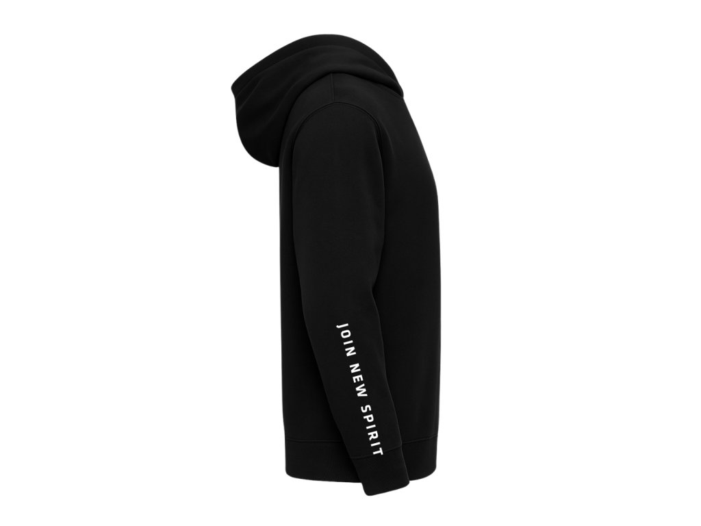 Černá unisex mikina s kapucí, pohodlný materiál na běžné nošení i na sport. Jednoduchý, minimalistický ale stylový design. Unikátem je potisk na předloktí, který při přeložení rukou tvoří nápis JOIN NEW SPIRIT ALLSTARS.
